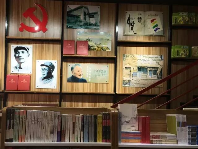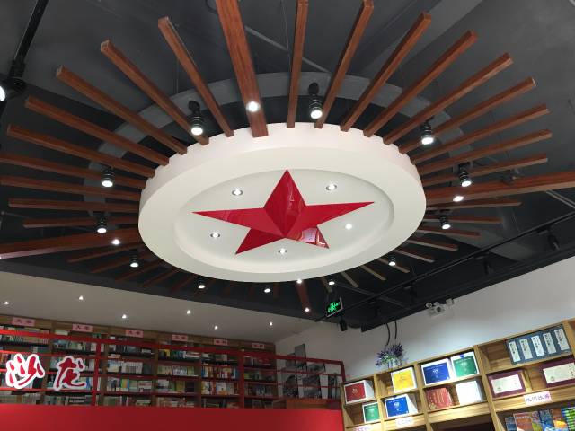 走进这家书店,镶嵌着红五星的巨大顶灯、墙壁上的红色党徽、红色主题图书展台、红色老照片等,让人置身其中会情不自禁地被带入到那些峥嵘岁月,从心底升起几分感怀、几分回忆。