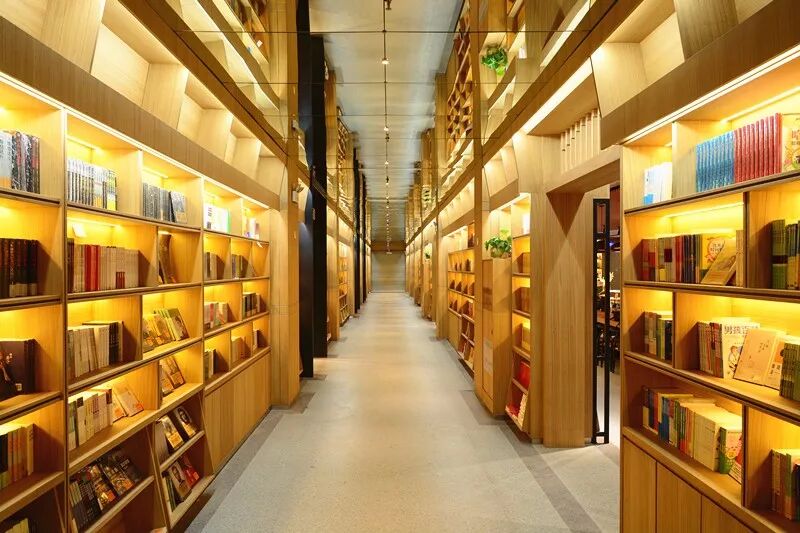 图书长廊区采用原木色的书架,一直延伸到视线尽头,营造出“知识隧道”的纵深感。屋顶借鉴钟书阁的镜面设计,配以暖黄色的灯光,拓展了视觉空间,让读者置身其中,充分感受到沉浸于书海墨香中的宁静与充实。
