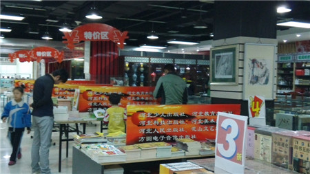 邢台市店在卖场内设立了新书七五折、特价书五折、冀版书四折专柜,并悬挂活动主题条幅。