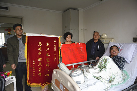 董聪同志目前精神状况良好,大脑意识清楚,给他的亲人以及所有关心他的人燃起了希望。张雨贵副书记传达了田建辉董事长及全省所有新华员工的慰问,并表示,这次为董聪同志捐款并不代表着结束,省店公司还会密切关注董聪同志的病情,愿他早日康复,重新回到工作岗位。董聪同志的亲属怀着无比激动和感谢的心情,向全省新华书店系统献上了一面锦旗和一封感谢信。“新华之爱暖人心,患难之时见真情”,锦旗上的这14个字,不仅表达了董聪一家对新华大家庭的感谢,更是对所有新华人的一种鼓舞和激励。