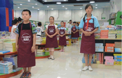 岗前培训后,小小图书管理员们穿好了专属小围裙,由工作人员带队,来到了书城一层少儿部指定工作区域,快速进入工作状态。