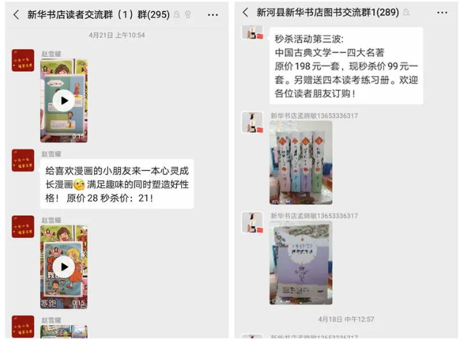 邢台市店通过微信群开展线上新书推介、图书打折优惠、秒杀活动以及直播分享会。